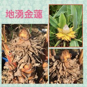 温室の外で枯れかけたこの植物の名は チヨウキンレン(地湧金蓮)。不思議な名前の由来を調べた。 地面から金色のハスの花が湧き出したように見えることから名付けられたとされますが蓮ではなくバショウ科 どんな花が咲くのかと見たら右上の写真で確かに蓮の花の様だ