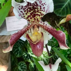 パフィオペディルム( Paphiopedilum) 名前は美の女神、ヴィーナスのスリッパ(サンダル)👡を意味する。ギリシャ語のパフィア(ヴィーナス)とペディロン(サンダル)に由来し、英名「レディースリッパ (Ladyslipper)」