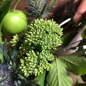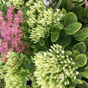 バスケットアレンジ。 オランダセダムの色に合わせて同系色にしてみました。 ゼラニウムとピットは育てているものを使ってます。