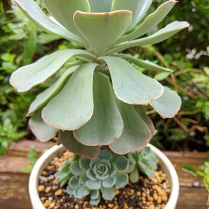 おはようございます🤗💕 昨日多肉さん軒下に避難させる時、七福神様が何か変😅 スカート履いた様になってペナペナ💦 一昨年まで、元気だったのに🤔 朝見たら昨日よりさらに😰 下のお子ちゃんはペナペナしてないです。 どうして?💦 6月に植えたから根づまりじゃないと、、 水は2日前に 昨日雨に当たってまた🤣 どうしてか解る方アドバイスお願いします😭