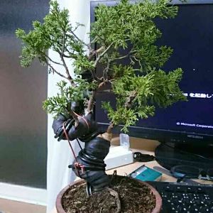 秋雅展でゲットしてきた真柏その二です。 根元に曲がありますが、上部が伸び放題になってしまっていて、太い枝ばかりで使える枝もほぼ無い状況です。 まずは根元にシャリを作って板幹とともに上部をゆっくり作っていくしかないかなと。 ちなみに右で液肥をあげているのはストライクガンダムで、しばらく押し入れで眠っていましたが、リビングに出してみたところ、息子も気に入ったようで、次の貰い手が決まったようです。