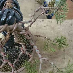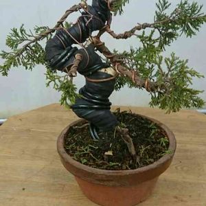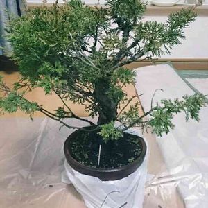 秋雅展でゲットしてきた真柏の盆栽素材です。 ビフォーの写真を撮っておけば良かったんですが、樹芯が伸び放題だったので、剪定して、さらに上に伸びていた樹芯を針金で伏せました。右上に伸びる枝はジンに剥くつもりですが、真っ直ぐ過ぎるので少し針金で曲を入れました。 左に伸びる太幹も使えないので、ジンにするしか無いですが、その下に少し出ている枝を芯に立て替えて作っていくことを想定しています。 立ち上がりの曲が少しだけ甘い感じはありますが、出来るだけのことはやってみようかと思っています。