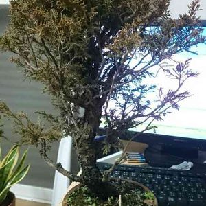 挿し木から作った真柏です。10年くらい経っています。寒さにあたって葉が少し茶色くなっています。樹高10cm。