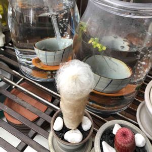 メダカ瓶の水換えた 幻楽爺さんサボテンが 白い帽子を 被るようになったんです