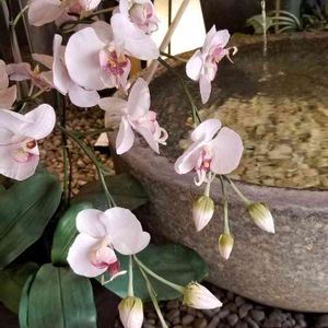 蘭のお花、フェイクだと大胆にお外に咲いていられますネ☺️ 夜勤明け、ちょっと手土産お買い物に立ち寄って…出された熱い緑茶🍵と、手水鉢に流れる水の音💦💦と…う~ン、小さなおもてなしにポッと温まりました。つかのまの休息をありがとう😌