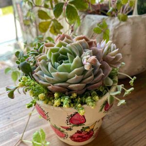 6種のセダムで セダム丼 真ん中少し窪んでますよね⁇ 植え付けが下手くそすぎて真ん中に植えた パープルヘイズがポロポロとれて悲惨な姿に😭 ピンセットでちまちま摘んで乙女心の根元にばら撒いておきました💦 1つだけ後から買ったセダムの名前がわかりません。 シルバーリーフが素敵なんですが、どなたかわかる方教えてください🙏