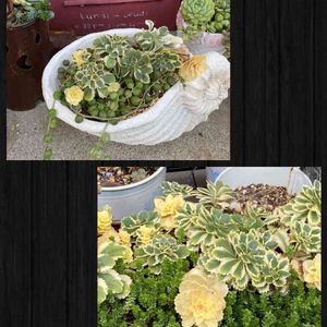 やっと晴れ☀️たね!先日picした工具箱🧰寄せ 伸びたのと、葉挿しっ子が大きくなったので 昨日のpicの多肉丼に追加 白ボタンとフーケリーと名無しの葉挿しっ子 隙間のセダムたちも、少し( アクレアウレウム)追加 その他は、それぞれの仲間の鉢に合流 結構豪華になった😁🎶