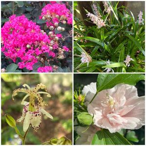 暑い中咲いてます。 左上 サルスベリ 右上 熨斗ラン 左下 ホトトギス 右下 八重ムクゲ 何故だかひっそりと咲いてます。