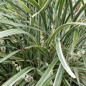 斑入りノシラン スノードラゴン(ユリ科・ジャノヒゲ属)葉っぱも、涼しげ💚 花芽がいっぱい出て 白い花が可愛い 秋には、🌼→🟢→🔵ラピスラズリのような青い実がなるそうです 楽しみよ💓