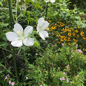台風遠くを通ってくれて助かりました 風の音は凄かったです 昨日の庭です モミジアオイご三つもさなを咲かせてました😊💕 周りのルドベキアタカオと、フロックスが 可愛く囲んでます