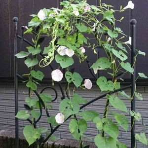 朝顔 アプローチのトレリスの丸葉だけ。 白(筒ピンク) 白(筒白) 紺条斑点絞り 赤条斑点絞り ミルキーウェイ