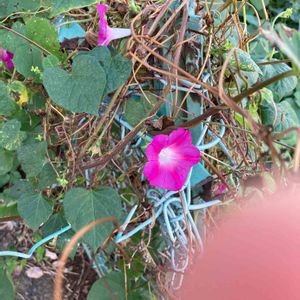 丸葉朝顔、初めて五つも咲きました。 花が咲く方に栄養が行っちゃって、葉っぱが小っちゃい💦💦