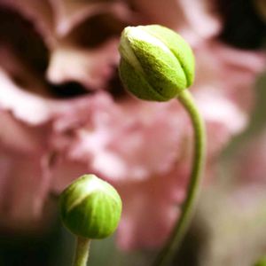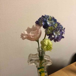 たらんと手前に垂れてるリシアンサス、紫の花と薄緑の蕾が1本の枝から出ています。 蕾が大きくなるにつれ緑から紫に変わってきました。 そして真ん中の白い花はリシアンサスっぽいですがアネモネです カラーも色とりどりで盛り沢山です😍