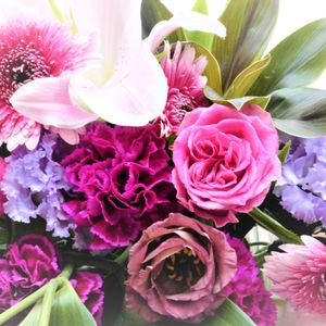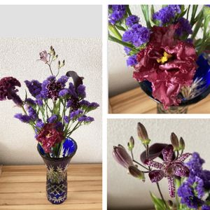 パープル系のお花を追加してアレンジを増強しました💜 紫色のお花は意外と種類がないそうです。 なのでこのお花のバリエーションは我ながら最強かも?と自画自賛ですが満足いくものになりました😁 ※紫色のケイトウだけは天然ではなく着色したものとのことでした😅