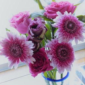 いただいたブーケは色がとても鮮やかなので、 バラして家のあちこちに飾りました♩ バラとリシアンサス? ガーベラみたいなのはガーベラでしょうか?