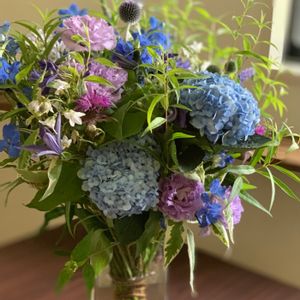レッスンで作ったブーケです。 ブルーカラーは普段あまり作らないので、とても新鮮でした!この時期、爽やかな気分になりますね。ラッピングも紺色にしたら花色が映えて豪華になりました。