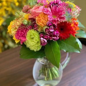 キャンディカラーのブーケ。 レッスンでの作品。 自分では選びそうもないカラーは勉強になります。ラッピングはネイビーで大人っぽくしました。