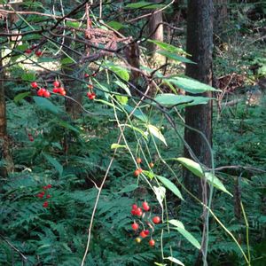 ナス科蔓性野草の赤い実り 8mmくらいの小粒です。 ヤマホロシ? マルバノホロシ? どちらかと思います😅⁉️🎵 お蔵晩秋picより