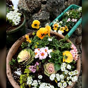 今日は月曜日 花ひろばの割引の日♡〜٩( ˃́▿˂̀ )۶〜♡ 売出しで50円のビオラさらに割引。 色々買って860円 このアリッサム家の寄せ植えの隙間に植え込みました。