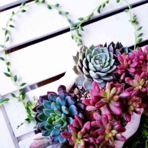 ベランダ庭より 過去の寄せ植えの成長を確認~👀 って今…休眠期だよね~🤣 けど…薄氷さんや樹氷さんは前より大きくなってたり~ 紅葉が少しあったり~ ピンクフリルさんは一回り小さくなってたり~ 詰め込み過ぎてて下葉を取りづらい~🍂👌 今日みたいに暖かったり…☀️ 夜冷え込んだり…❄ 人間も多肉さんも対応するの大変~だよねぇー(✘д✘๑;) ³₃ あ...💦 チューリップの球根…見る見る根を出して大きくなってる~🌷