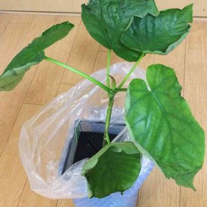 到着時から葉が元気なさげなウンベラータくん。 暖かくして様子見。