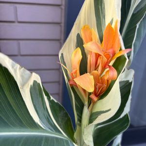 カンナ シュトゥットガルト 緑と白の葉が非常に美しいカンナが開花しました! 植え付けてから2年くらいは葉焼けが酷かったですが、環境に適応したのか、現在は葉焼けはさほど目立たなくなって花もしっかり咲くようになりました😆😆