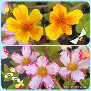 こんばんは😊 毎日🥵🥵🥵🥵ですね💦 🏠今朝の庭 ①ポーチュラカ🌸🌼 ②ヒカダマ🌵29個目の蕾🥰 ③カリブラコア🌼 ④種まきした赤いパプリカ🫑🟥 大きく育ってきてますよー🌱*゜ ⑤カンナ シュトゥットガルトの葉 ふふふ(*´v`)