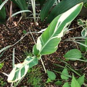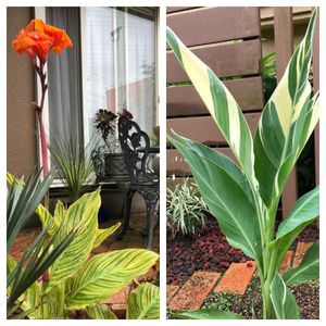 もう1枚は、今年葉焼けが酷くて、1.5m高から成長が止まり、花芽をつけてくれないシュツットガルトさん(;^_^A 開花草丈が3m超のムサフォリアには及ばないけど、開花草丈2.5mの超大型級カンナさんで、大きな斑入り葉も見応えあります🥰✨ ただ、斑の入り方が不規則で、白い斑の部分が多いと……今年みたいに葉焼けが酷くなって、オレンジ花がなかなか見られないことがあるのが玉に傷ですよね😅 真夏に遮光してあげるべきか、或いは半日陰っぽい場所に植えかえるべきか……悩みどころです🤔 *斑入り好き♡、斑入り愛好家に参加させて下さいませ🤗💕