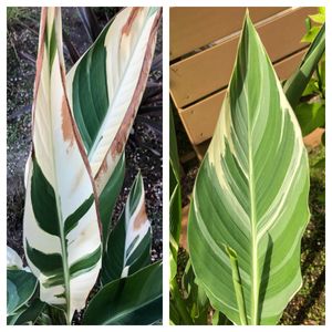 カンナ →ベンガルタイガー💚💛 ←シュトゥットガルト💚🤍 こちらも斑入りのカンカ葉がキレイ なんです✨シュトゥットガルトは他のカンナと比べると小さくて薄いオレンジの花が咲きます♡真っ白な葉が出ました🤍