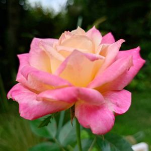 我が家のバラ開花28番目は、サシェの初花。 ロサオリエンティスノヴァの黄色系複色バラ。 最初マチルダかと思うくらいピンク色で咲いて、 花瓶に入れて一晩たったら黄色く開いていました。 花びらの枚数も少ないし香りもほんのりだしまだまだ未熟な初花です。