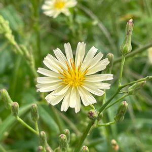 アキノノゲシ…かと思ったけど、アキノノゲシは葉っぱがワサワサ育っているけど、でもまだ蕾もあがっていない。 この花はその葉っぱの間から咲いています🌼 ゴソゴソ葉っぱをかき分けて根元を見ると、切れ込みのない葉っぱが🍃 花のつく茎も、アキノノゲシよりずっと華奢で、枝別れも数少ない。 これはホソバアキノノゲシ⁇ 花の時期がこんなにズレてるって、たまたまかしら? ググってみたけど、華奢なのはこのコの個性みたい😅