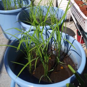 笑って下さい😆一人でたのしいお遊びの思い出🌾🌾🌾 2016年、捨てられてた稲苗をプランター等に植えて、暫し子供の頃にほんの少しだけ体験した田植え、稲刈りを懐かしんだ事があります。 翌2017年、その取っておいた種もみを芽出しして(トレー奥に写ってますが、見えるかな) HC処分価格で買った苗(手前)と共に又植えたみたい、出来たら買ったお米に混ぜたような?(その後写真未検索、覚え無し(^◇^;)) 又、機会あったらしてみようかな☺️