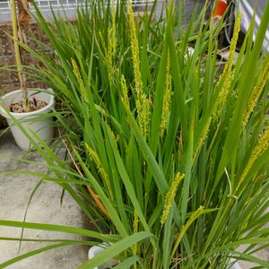 小5の息子の夏休みの宿題。 バケツ稲作。 稲穂がなっている。新米だよ! 最近の授業は面白いなあ。