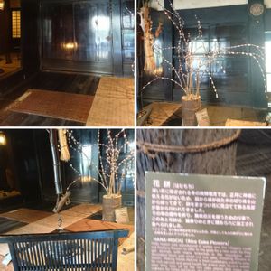 2/24(日)⑤ 三渓園合掌造りの家の茶の間の囲炉裏のそばには花餅がありました。 奥は黒光りした木の扉です。 神棚も柱も振り子時計も黒いですね。 町田、相模原の方では1/15前に書き初めを燃やして1年間の健康や願い成就を願う「どんど焼き」があります。その時に花餅を火であぶって食べるので、花餅見たことがあります。 面白いからとうちの子どもたちを、実家の兄が小学校の校庭で行われるどんど焼きに呼んでくれたことがあるんです。 子どもたちは従姉妹や従弟と遊ぶ方が面白かったみたいでした😄
