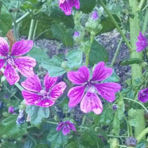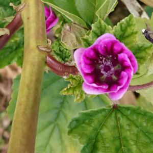 「ウスベニアオイ」または「ゼニアオイ」散歩道の道端に咲いていました。😳 観賞用またはハーブとして栽培されており、ウスベニアオイの乾燥させた花を入れたハーブティーは「夜明けのハーブティー」と呼ばれています。😋 鮮やかな青からグレーに変化し、さらにレモンを加えると、パッと茜色に🤩 夜明けのハーブティーと呼ばれている所以です。🤔