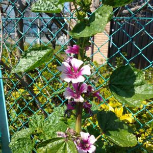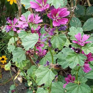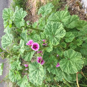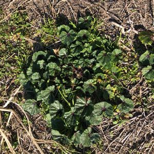 芽を吹いたゼニアオイ、もしくはウスベニアオイの葉 ゼニアオイやウスベニアオイは高さ60〜120センチほどに茎を伸ばして花を咲かせますがここは畦道で踏まれるからかいつも地面近くで花を咲かせています 環境に応じて進化しているのかもしれないなぁといつも不思議に思いながら見ています