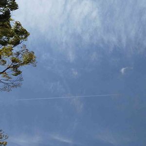 通りすがりに空を見上げましたら、飛行機雲があり、沢山の雲が強風で流されていました。 2022/04/01(金)15:40.晴れ.強風.寒い スマホ📱で撮影しました☺️