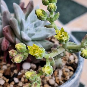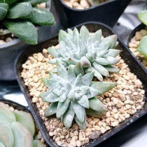 元気に育っています🩵 ①ダドレアグリーニー、あまり成長しませんが、二頭になりました🩵🩵 ②寄せ植え元気です💗 ブルーエルフが増えました💗 ③寄せ植えが育ち、個性が際立っています🩵🩷🩵🩷