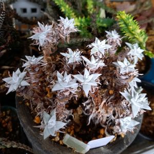 外の多肉棚で頑張っている多肉ちゃんたち💕 ①薔薇の花🌹みたいなシルエット✨ ②ちょっと不気味?な血飛沫模様になっているアルジェ😆💦 ③クールな色合いになっているダドレア グリーニー🎶