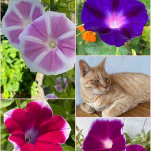 おはようございます みちのすけさんの、ニャンニャン祭り 参加します😊 みゃんちゃん朝顔に囲まれて〜💓 あっ💦 アップにすると、 朝顔にも見えるペチュニアも一緒でした〜😅