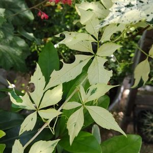 🏷8日は葉っぱの発表会 斑入りアメリカヅタ🌿 斑が とっても綺麗なんです。 左上↖️、グリーンと、フイリ 半々の葉が面白いですよね。🌿