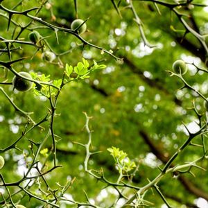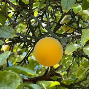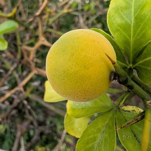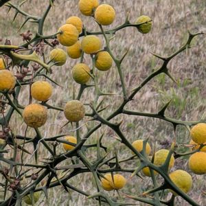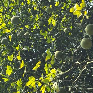 トゲトゲの枝にカラタチの緑の実がなっていました✨ スダチくらいの大きさですが、苦味と臭気で生食はしないそう😂 でも薬用効果はあるそうです。