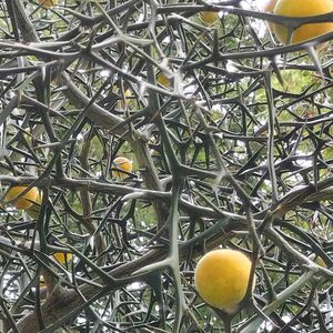 おはようございます✨☀️✨❇️ 台風接近中ですねー🍃🌀☔ 嵐のまえの静かな朝です 黄色い実のカラタチの木をはじめてみました🍋 テニスボールじゃないですよ🎾😃 イバラのような木なんですねー 府中の郷土の森で出会いました🍀
