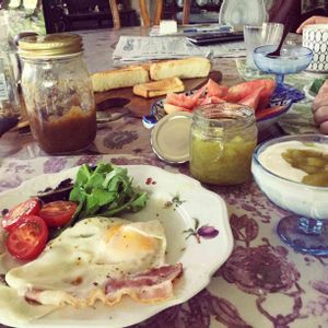 🍽 手作りジャム二種類 🍽 今朝の朝食🍞🥐の風景です。雑然としたpic、ご容赦くださいませ。 友達🤝が作ってくれたグリーン色のルバーブのジャムと梅酒の梅で作ったジャムです。 二種類とも美味しいですよ。 ちなみにヨーグルトも手作りの物です。