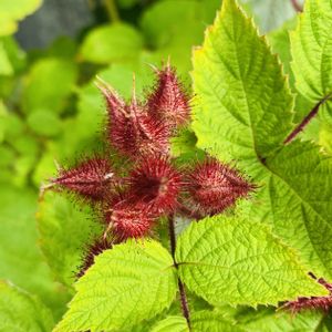 エビガライチゴ バラ科キイチゴ属 落葉低木 花期:6、7月 茎や枝に紫褐色のトゲがあり、太い蔓は成長すると2mくらいになる少し大型の木苺です。 小さな淡紅紫色の花を咲かせ、梅雨頃に赤く鈴成りになる果実は、直径1.5cmと大きくて甘く、木苺の中でもトップクラスだという事です。 まだ食べたことはありません。