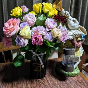 ウサギの置物と沢山の花束を 頂いたので早速 ダイニングテーブルに飾ってます。 皆さん素敵なXmasを お過ごし下さい🎄🌹🔮🎵🐇