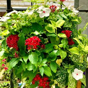 ペンタスと日々草の ハンギング🌿 お気に入りの園芸店で 素敵なハンギングが 飾ってありました😊🌿 なかなか真似できない 組み合わせです。 ペンタスをハンギングに するという発想は 無いですからね😊