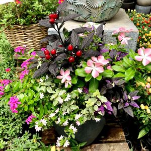 素敵な秋の寄植え🌿 五色トウガラシ、日々草 など、ぎっしりと植えて ありました。 お気に入りの園芸店にて🌿
