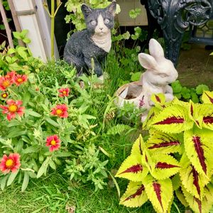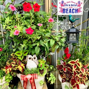 寄植えとハンギングエリア🌿 地植えしたコリウスが紫陽花の 葉っぱより大きく巨大化し、 ハンギングのペチュニアも次々と 咲いて朝と夜の水やりと花柄つみ のみの作業を毎日繰り返してます😊庭作業は楽しいです🐣🌿