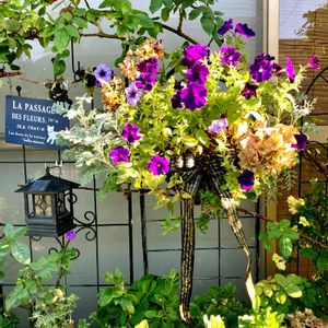 2鉢のペチュニアのハンギングを 1つの鉢にまとめて作り直しました🌿シロタエギクは2年前の Xmas用のシクラメンの ハンギングの時のを そのまま使用してます。 増えてくるので株分けして あちこちに